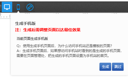 ?可用版本:基礎(chǔ)版,標(biāo)準(zhǔn)版,營(yíng)銷版的PC+手機(jī)套餐(單PC或手機(jī)不適用)支持轉(zhuǎn)換的插件有:文章分類/文章列表/百度地圖/容器/按鈕/在線客服/線條/圖片/導(dǎo)航/文本/會(huì)員登錄(頁(yè)腳中的模塊不會(huì)被轉(zhuǎn)換)①.Pc版新建頁(yè)面,編輯好頁(yè)面之后,雙擊手機(jī)按鈕,彈出提示,點(diǎn)擊生成,即可將當(dāng)前頁(yè)面生成手機(jī)版,如選擇跳過(guò),將不生成頁(yè)面直接進(jìn)入手機(jī)站②.生成手機(jī)版,Pc的插件將生成相應(yīng)的手機(jī)插件,如果是手機(jī)中沒(méi)有的樣式,將生成該手機(jī)插件的第一個(gè)默認(rèn)樣式。手機(jī)中的布局將根據(jù)自主研發(fā)的算法來(lái)生成含"底版"的PC頁(yè)面在生成手