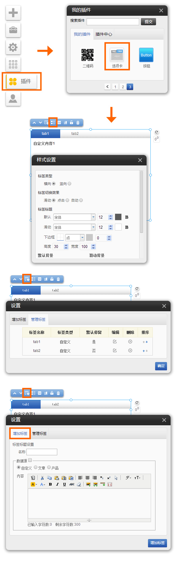 選項(xiàng)卡插件 使用方法:進(jìn)入網(wǎng)站編輯-〉點(diǎn)左側(cè)插件圖標(biāo)-〉插件中心,找到選項(xiàng)卡圖標(biāo),點(diǎn)啟用 A可選擇數(shù)據(jù)源,支持3種類型 a自定義支持在線編輯器,可以錄入文本或插入圖片 b文章調(diào)用系統(tǒng)文章數(shù)據(jù),支持圖文和文本樣式設(shè)定 c產(chǎn)品調(diào)用系統(tǒng)產(chǎn)品數(shù)據(jù),可以支持按照分類和標(biāo)簽組合條件查詢,支持圖文和文本樣式設(shè)定 B標(biāo)簽類型支持橫向和豎向,切換效果支持3中效果:滑動(dòng)、點(diǎn)擊和自動(dòng)(豎向暫不支持自動(dòng)切換) C支持標(biāo)簽標(biāo)題和標(biāo)簽背景相關(guān)樣式設(shè)定 D每個(gè)選項(xiàng)卡插件可支持添加8個(gè)標(biāo)簽,支持調(diào)整標(biāo)簽順序,設(shè)置默認(rèn)停留
