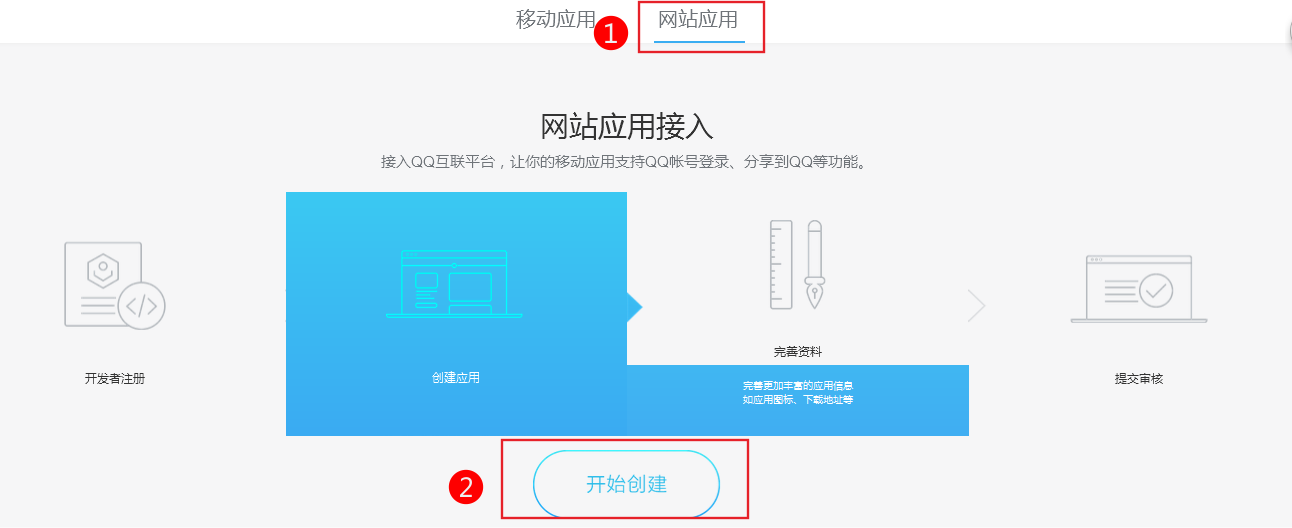 1、申請(qǐng)QQ互聯(lián)1.開(kāi)發(fā)者注冊(cè)1.在QQ互聯(lián)開(kāi)放平臺(tái)首頁(yè)http://connect.qq.com/,點(diǎn)擊右上角的“登錄”按鈕,使用QQ帳號(hào)登錄。重要提示:開(kāi)發(fā)者QQ號(hào)碼一旦注冊(cè)不能變更,建議使用公司公共QQ號(hào)碼而不是員工私人號(hào)碼注冊(cè),以免遇到員工離職等情況造成不必要的麻煩。2.登錄成功后會(huì)跳轉(zhuǎn)到開(kāi)發(fā)者注冊(cè)頁(yè)面,在注冊(cè)頁(yè)面需要提交公司或個(gè)人的基本資料。2.網(wǎng)站接入申請(qǐng)網(wǎng)站接入前,需首先進(jìn)行申請(qǐng),獲得對(duì)應(yīng)的appid與appkey,以保證后續(xù)流程中可正確對(duì)網(wǎng)站與用戶進(jìn)行驗(yàn)證與授權(quán)。2.1添加網(wǎng)站開(kāi)發(fā)者注冊(cè)成功后,會(huì)跳轉(zhuǎn)到“管理中心”頁(yè)面。點(diǎn)擊