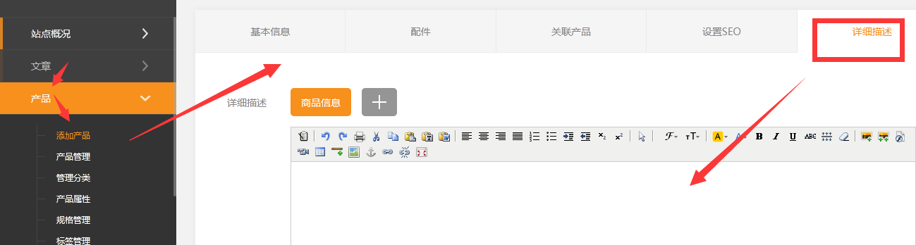 產(chǎn)品和文章數(shù)量均未作限制,實際數(shù)量受產(chǎn)品和文章的素材內(nèi)容大小影響,建議產(chǎn)品和文章的總數(shù)量不超過5萬個。超過可能會影響后臺加載速度,嚴重情況下可能出現(xiàn)異常。本小節(jié)共包含5點。1、依次點擊產(chǎn)品-》添加產(chǎn)品2、商品應(yīng)該包括那些內(nèi)容呢?可能最基本的應(yīng)該是以下幾點:商品類別:一件商品必須屬于一個類別,這個便于管理所以可能添加分類往往是第一步的。商品名稱:一件商品當(dāng)然也是必須有這個商品的名稱商品圖片:只有精美的圖片,才能讓買家對你的商品產(chǎn)生足夠的興趣。商品價格:要出售商品,當(dāng)然也必須給這個商品指定一個價格,系統(tǒng),提供