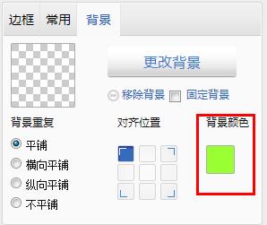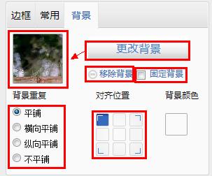 如果選擇使用圖片,則:點擊“更改背景”,從“我的圖片”中選擇對應的圖片后即可直接生效;點擊“移除背景”將會刪除該背景;勾選“固定背景”則無論圖片尺寸多少,該背景相對于模塊的位置不變;左下角可以設置背景重復和對齊位置。