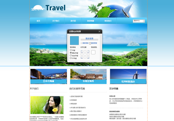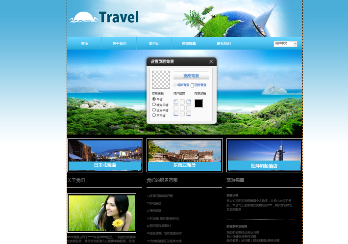 每一個(gè)模板均已設(shè)置好頁面背景和站點(diǎn)背景,原有的背景可以是圖(可以設(shè)置排列的方式),也可以是顏色的填充,如需修改,請先清除原有的背景。請注意,清除后將不能恢復(fù)。如顯示如下,則表示,當(dāng)前頁面沒有設(shè)置背景,即這個(gè)頁面是透明的,可以直接看到“站點(diǎn)背景”