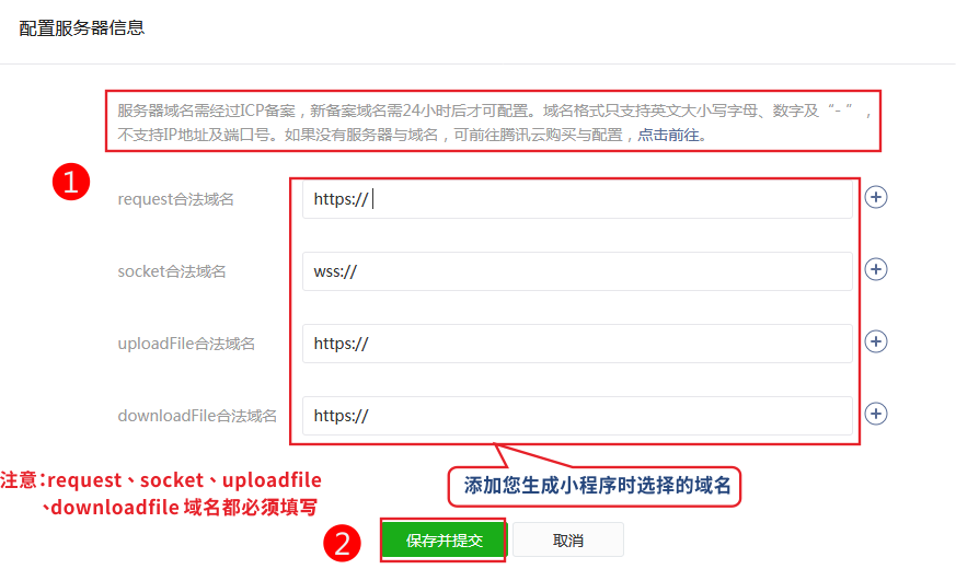 (request、socket、uploadfile、downloadfile 4個都填同一個域名即可,socket 合法域名需要以 wss://開頭,其它項目不用填寫)