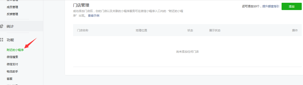 ①.登錄小程序賬號,點擊左側(cè)功能-》附近的小程序,點擊開通,注意開通條件是:主體必須是企業(yè)、媒體、政府和其他組織的小程序