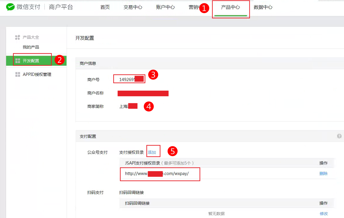 登陸 微信商戶平臺(tái) 找到產(chǎn)品中心 -》開發(fā)配置 獲取到 商戶號、商家簡稱 如下圖