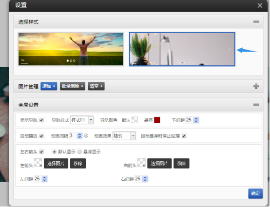 左右箭頭:可選擇鼠標(biāo)懸停之后圖片是否停止輪播。并且可上傳箭頭圖片,及修改間距