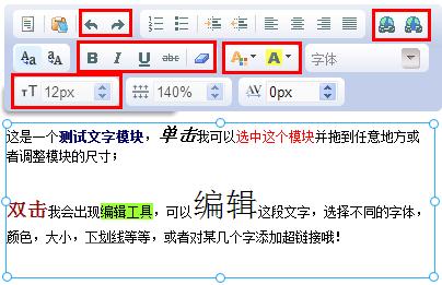 雙擊編輯區(qū)域就可以調(diào)用出文本編輯工具條, 進行文本編輯. 文本模塊上方有一排功能按鈕, 他們的具體功能如下:
