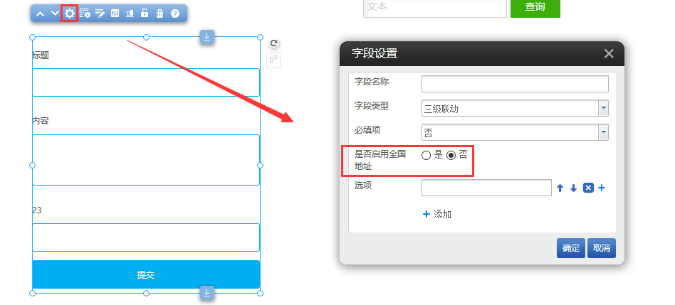 在建站前臺(tái)拖出“留言”-“留言表單”插件,點(diǎn)擊字段設(shè)置,字段類型選擇三級(jí)聯(lián)動(dòng),新增了是否啟用全國(guó)地址設(shè)置項(xiàng),選擇是則會(huì)自動(dòng)讀取地區(qū)信息。如圖所示: