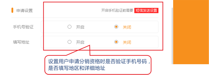 3.分銷申請(qǐng)?jiān)O(shè)置,此處可以設(shè)置用戶在申請(qǐng)分銷商資格時(shí)是否驗(yàn)證手機(jī)號(hào)碼,是否填寫地區(qū)和詳細(xì)地址