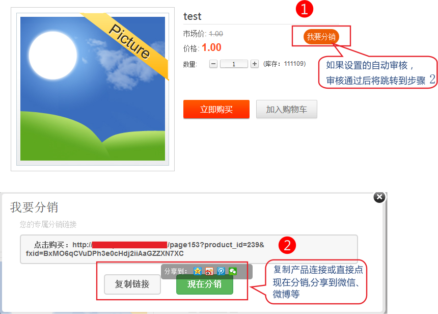 3.3.點(diǎn)擊我要分銷,審核通過后可以復(fù)制鏈接通過郵件等方式分銷,或直接點(diǎn)擊現(xiàn)在分銷,將產(chǎn)品推送到您的微信-》微博