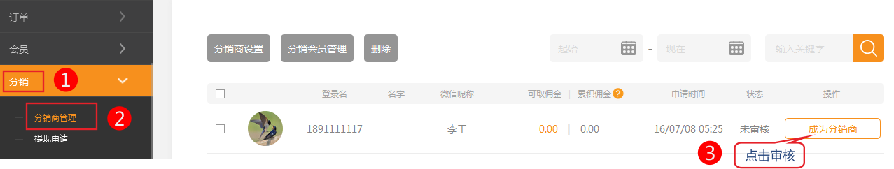 2.2 在后臺(tái) 分銷-》分銷商管理中手動(dòng)審核