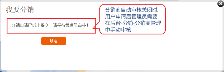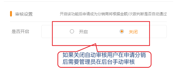1.如果關(guān)閉自動(dòng)審核功能,用戶在申請(qǐng)后需在在分銷商管理中手動(dòng)審核。
