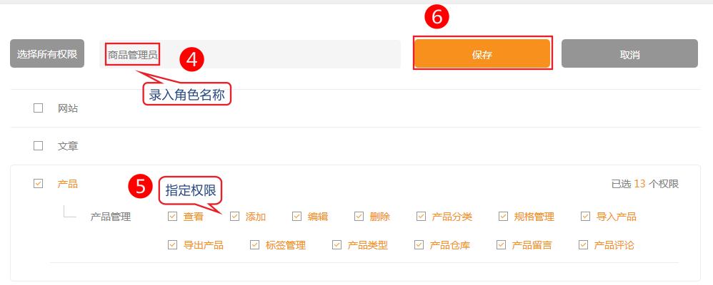 此角只有商品方面的權(quán)限。如果想再為這個(gè)角色增加其它權(quán)限.