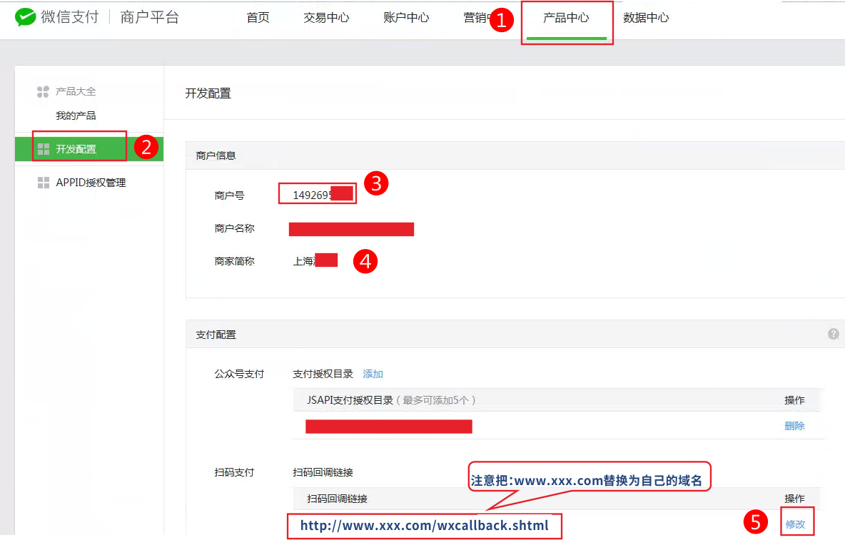 登陸 微信商戶平臺(tái) 找到產(chǎn)品中心 -》開發(fā)配置 獲取到 商戶號(hào)、商家簡(jiǎn)稱 如下圖