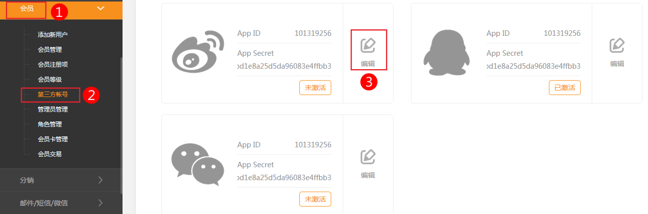 1.在網(wǎng)站管理中依次點擊 電子商務(wù)-會員管理-第三方帳號-》編輯新浪微博