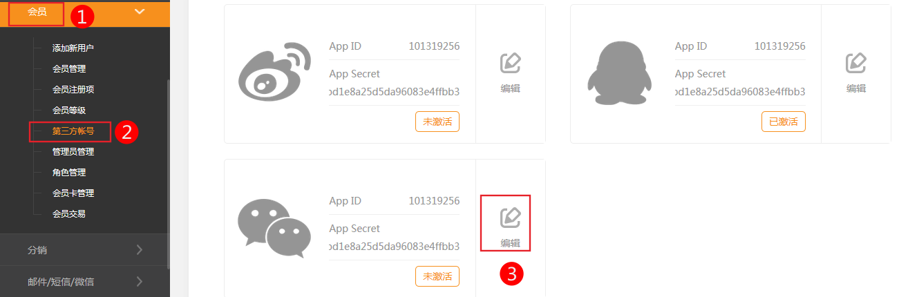 1、依次點擊 后臺-》會員管理->第三方帳號-》編輯