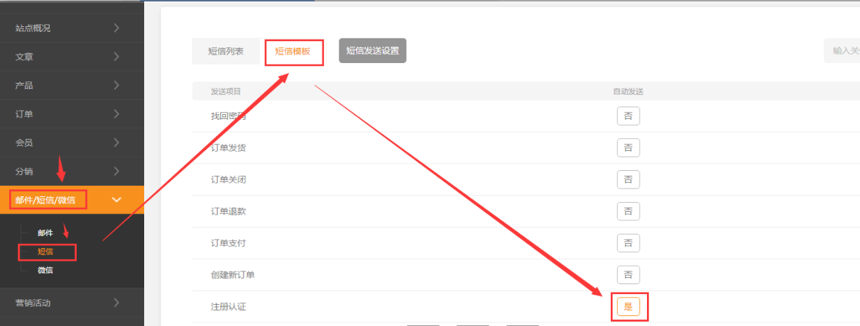 6.由于短信運營商,需要進行測試審核,還必須參考截圖所示,將需要短信自動觸發(fā)發(fā)送的設(shè)置項設(shè)置為啟用。