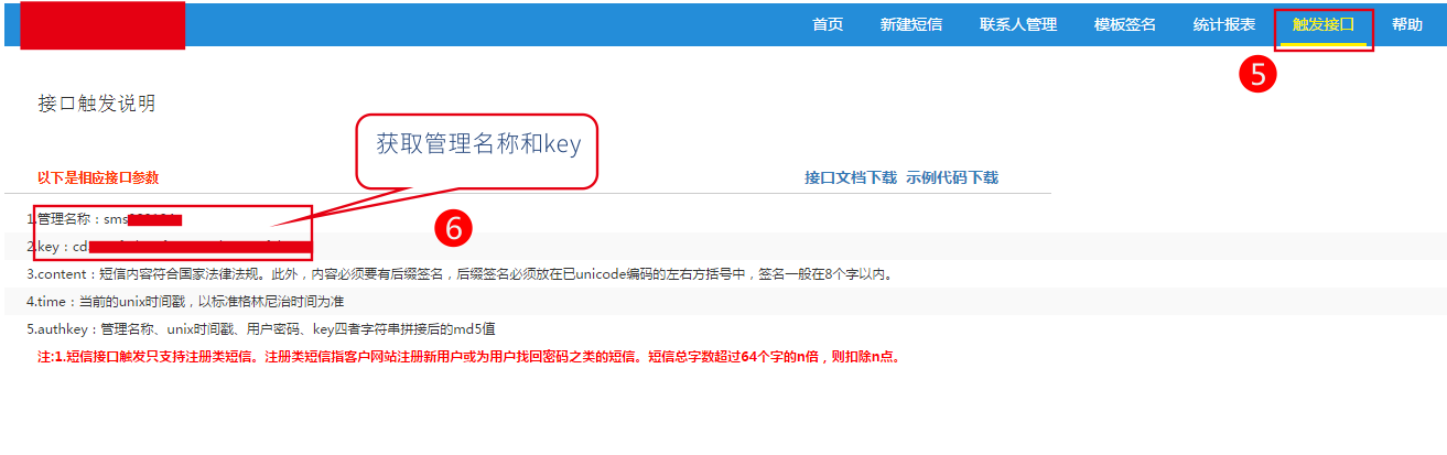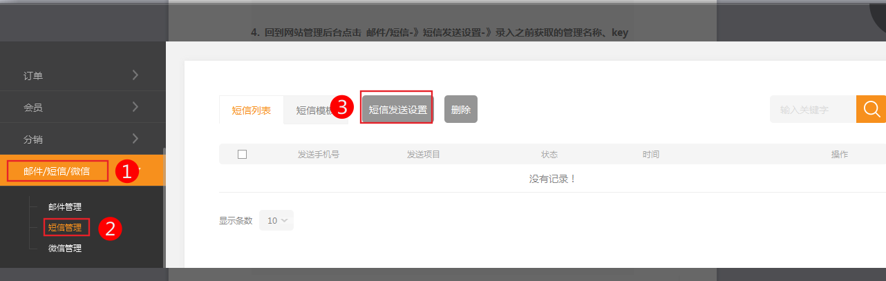 4. 回到網(wǎng)站管理后臺點擊 郵件/短信-》短信發(fā)送設(shè)置-》錄入之前獲取的管理名稱、key值、密碼和簽名