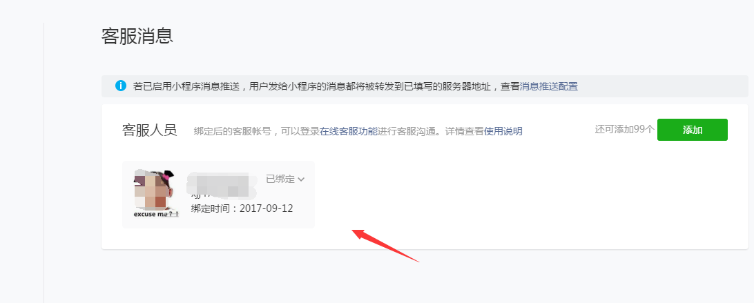 ①https://mp.weixin.qq.com/登錄小程序賬號,選擇客服消息,可以添加客服人員,最多可綁定100個