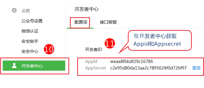 3、在開發(fā)者中心獲取Appid他Appsecret