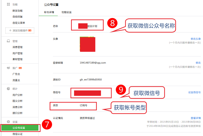 2、在設(shè)置公眾帳號(hào)設(shè)置中獲取到 帳號(hào)名稱、及微信號(hào)。