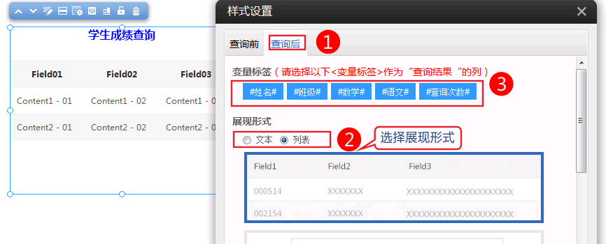 5.設置查詢后的樣式為列表,并錄入字段的變量標簽如下圖: