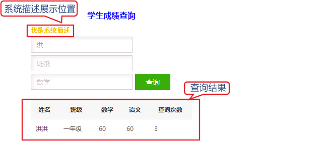模糊查詢:輸入“姓名”“班級”“數(shù)學”其中一個條件,例如”小“,查詢結(jié)果會出現(xiàn)所有姓名中帶有“小”的內(nèi)容,如下圖: