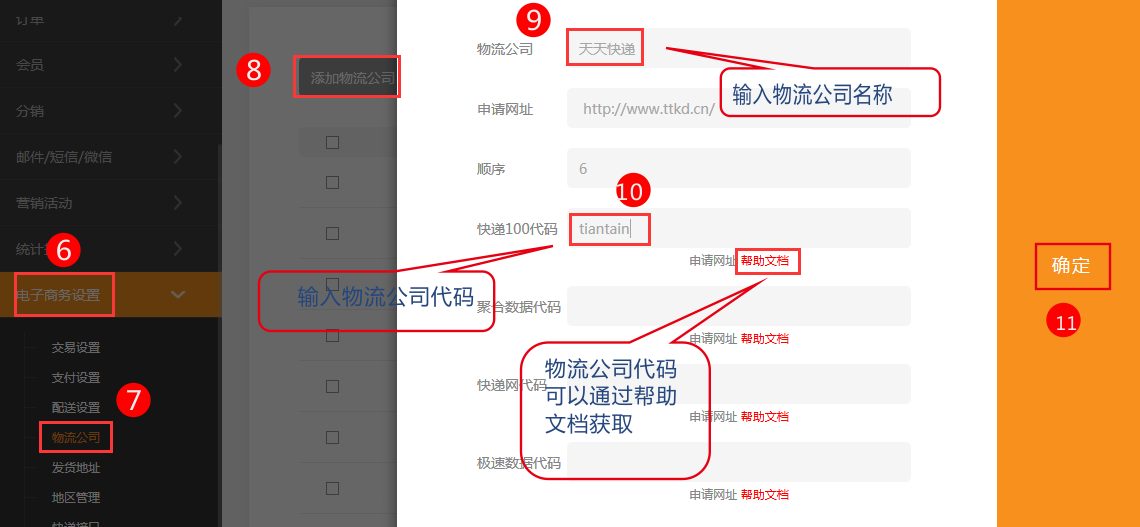 5,在電子商務設置-物流公司中添加物流公司名稱和代碼。