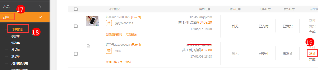 7.在訂單管理中找到訂單,點擊發(fā)貨按鈕。