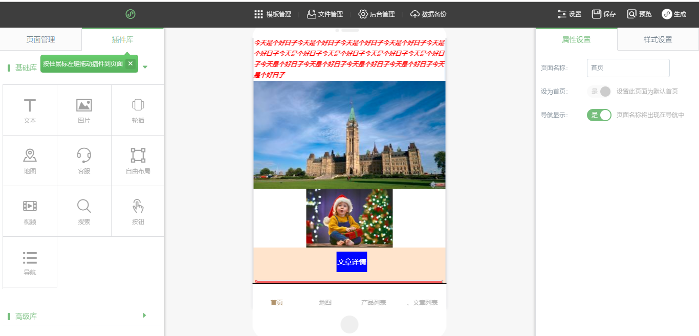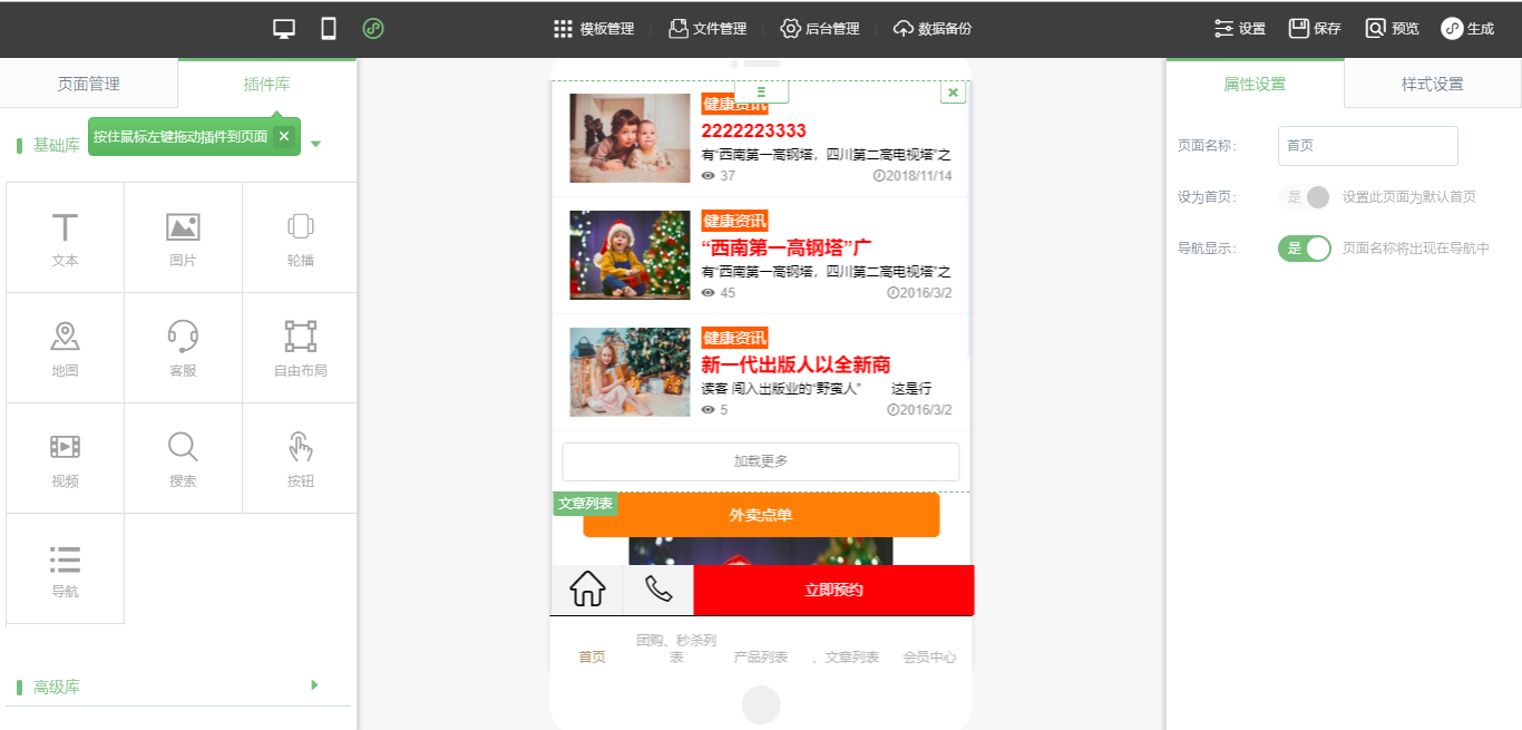 1.在編輯器中,將需要的插件拖入到編輯器中,點擊保存,然后點擊生成,選擇“支付寶”,并點擊下載即可,其他操作方式與“支付寶小程序標準版”一致,這里不做贅述,如圖所示: