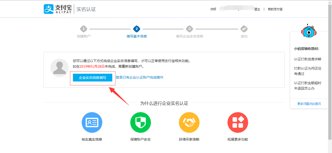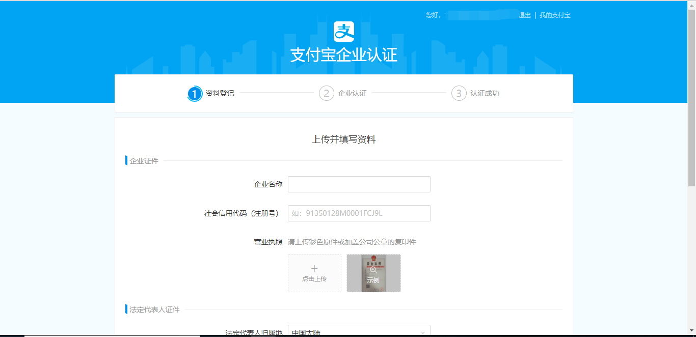 注冊賬號填寫郵箱賬號后,在郵箱中會收到一封郵件,點擊“繼續(xù)注冊”,填寫完所有信息后會出現(xiàn)“企業(yè)實名填寫頁面”,點擊進入,填寫信息通過認證即可,如圖所示: