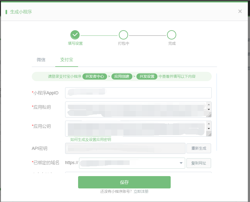 小程序在小程序編輯器中,拖入需要展示的插件(目前暫時不支持表單以及視頻插件),點擊生成,選擇“支付寶”,并填入剛剛申請好的公鑰、私鑰、以及小程序ID號,點擊生成即可,然后下載“支付寶小程序開發(fā)者工具”,將下載好的項目在“支付寶小程序開發(fā)者工具”中打開即可,如圖所示: