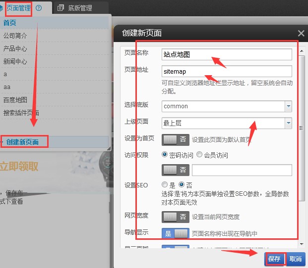 如果沒有ftp以企業(yè)建站為例,復(fù)制超級鏈接代碼 然后先進(jìn)入網(wǎng)站編輯 在頁面管理-》創(chuàng)建新頁面 -》頁面名稱填站點地圖 頁面地址寫sitemap -》底板選擇sitemap 導(dǎo)航是否顯示設(shè)置為否 然后保存