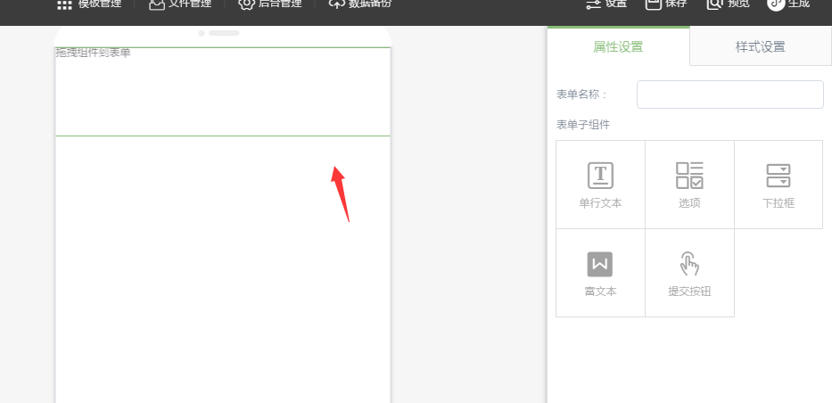 ②.拖入表單到編輯區(qū)域,如下圖,選中該表單,右側(cè)的屬性設(shè)置會出現(xiàn)表單子組件,需要用戶將需要的表單子組件拖入表單容器中,并且命名表單的名稱,以便后臺區(qū)分