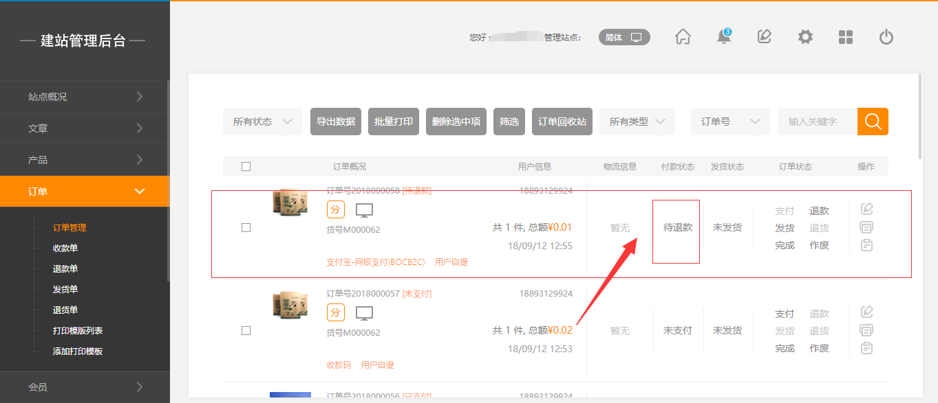 1. 在建站后臺(tái),“訂單”-“訂單管理”頁(yè)面,當(dāng)訂單支付方式為微信且用戶申請(qǐng)退款,現(xiàn)在只要配置正確證書,點(diǎn)擊“保存”即可原路退款,如圖所示: