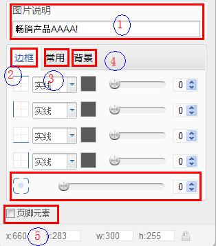 在圖片“屬性”的設(shè)置界面的下半部分,有5個(gè)主要的功能:圖片說明、圖片模塊邊框、常用、圖片模塊背景和頁腳元素。