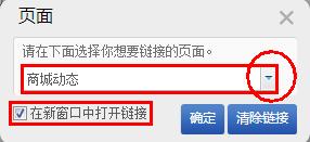 “頁面”:是指可以將圖片鏈接到您網(wǎng)站上面的某個(gè)頁面, 屬于站內(nèi)鏈接。設(shè)置好后,客戶點(diǎn)擊這個(gè)圖片,就會(huì)打開目標(biāo)的頁面以達(dá)到展示更多內(nèi)容的目的。如下圖中鏈接指向“商城動(dòng)態(tài)”,則訪客點(diǎn)擊這張圖片時(shí),會(huì)打開“商城動(dòng)態(tài)”這個(gè)頁面。