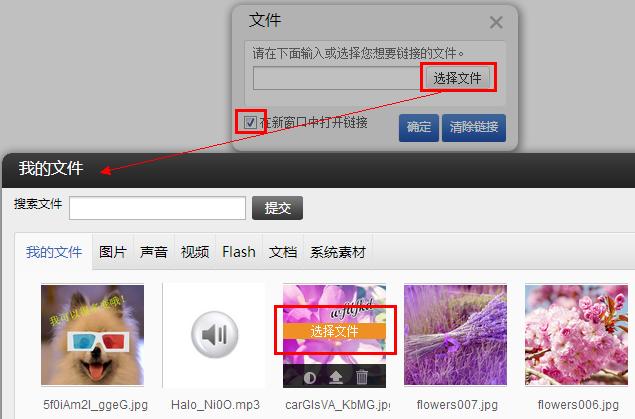 “文件”:是指可以將圖片鏈接到您已上傳在“我的文件”中的文件(如jpg,pdf,word,mp3等等)。當(dāng)點(diǎn)擊該圖片時(shí),系統(tǒng)會(huì)調(diào)用訪客本地電腦的相關(guān)程序并打開相應(yīng)的文件。注意:如果訪客本地客戶端沒有可以支持的軟件或者版本不支持,將無法打開這個(gè)文件。添加的方式如下圖:選擇好文件后確定,再保存即可。