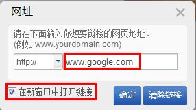 “站外鏈接”:是指可以將圖片鏈接到互聯(lián)網(wǎng)上的某個(gè)頁面或某個(gè)站點(diǎn), 只要您把地址填進(jìn)去即可。如下圖,以www.google.com為例,勾選“在新窗口打開鏈接”可以在新增的選項(xiàng)卡中打開www.google.com的頁面。