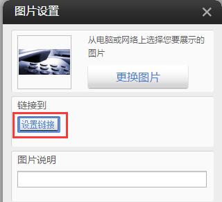 , 系統(tǒng)彈出圖片設(shè)置對(duì)話框, 可以點(diǎn)擊設(shè)置鏈接按鈕選擇鏈接到:網(wǎng)址、頁面、郵件、文件等您需要的的地方。