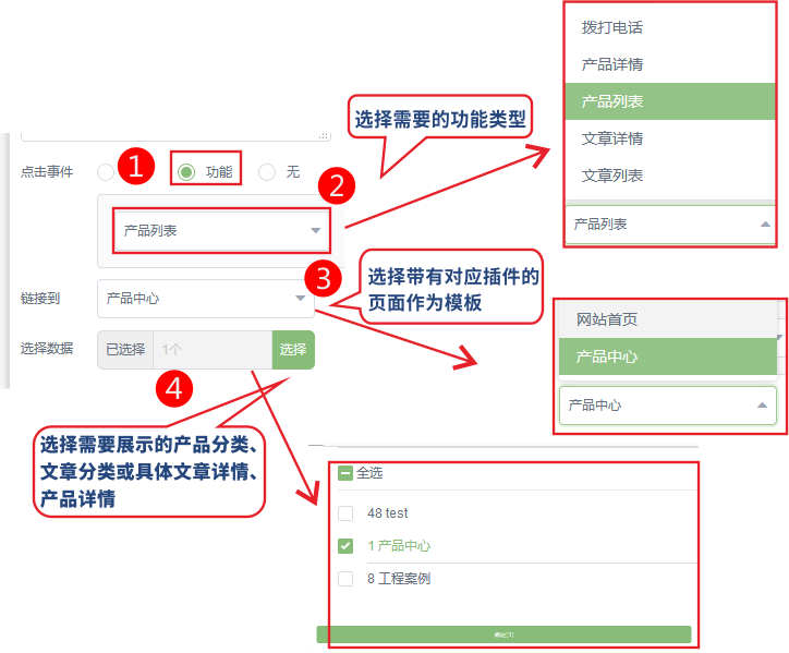 如果選擇的是產(chǎn)品詳情,下方同樣出現(xiàn)鏈接和選擇數(shù)據(jù),但是需要鏈接到帶有產(chǎn)品詳情插件的頁面,選擇數(shù)據(jù)將會顯示產(chǎn)品詳情,用戶可以選擇顯示指定的產(chǎn)品詳情