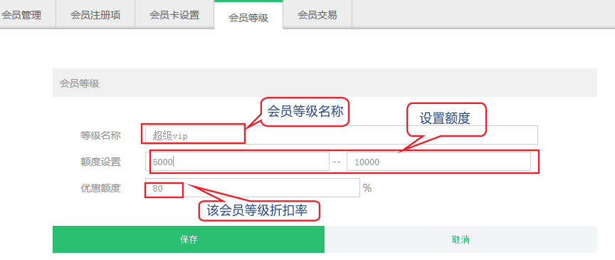 分別填寫等級名稱、額度設置、優(yōu)惠額度,保存即可