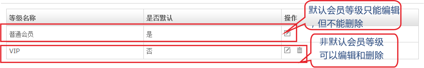 注意:默認會員是可以編輯但不能刪除的,新會員注冊后直接成為此等級會員,每個商店必須有且只有一個默認的會員等級!