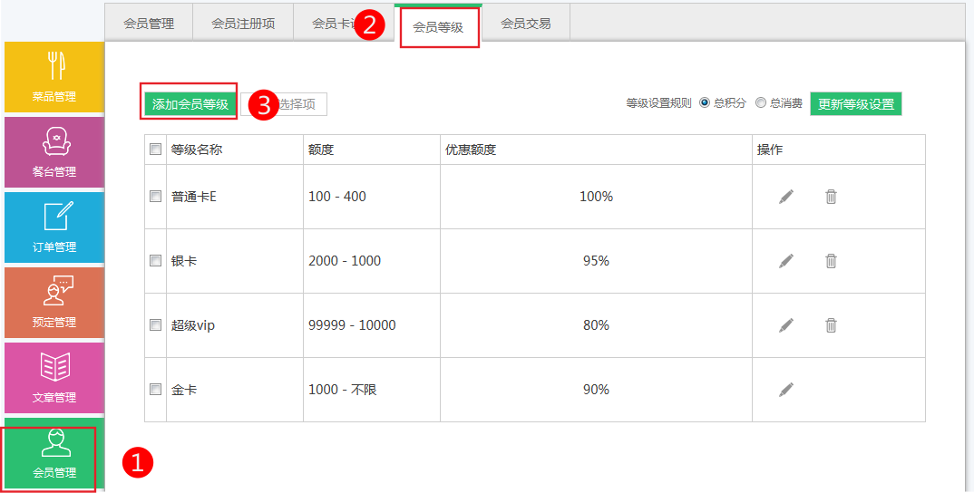 d、會員等級設置規(guī)則時用戶只能選擇按總積分或按總消費中的一種,并且設置后系統(tǒng)自動調整會員等級。