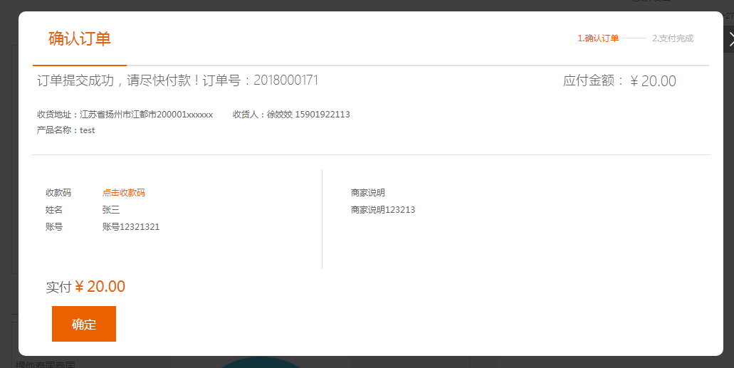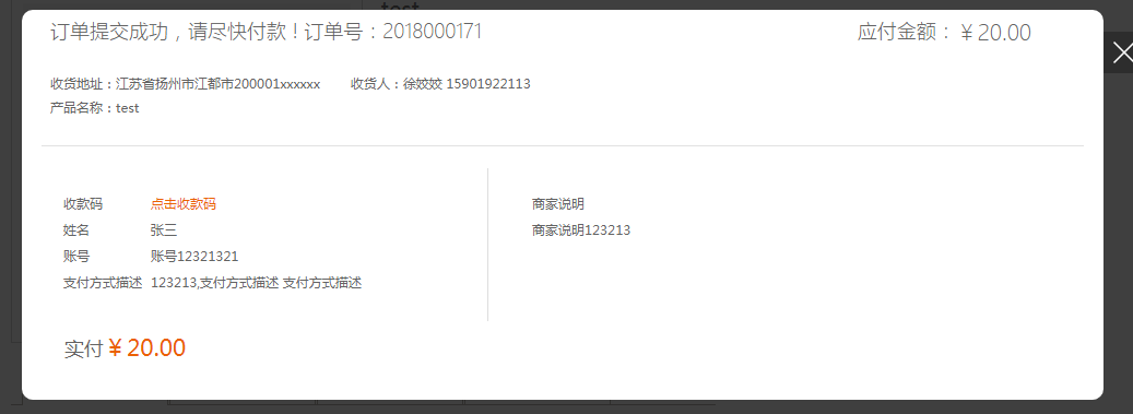 ③.pc前臺頁面預覽:提交訂單之后,會出現(xiàn)下方彈窗,展示了后臺填寫的相關收款信息