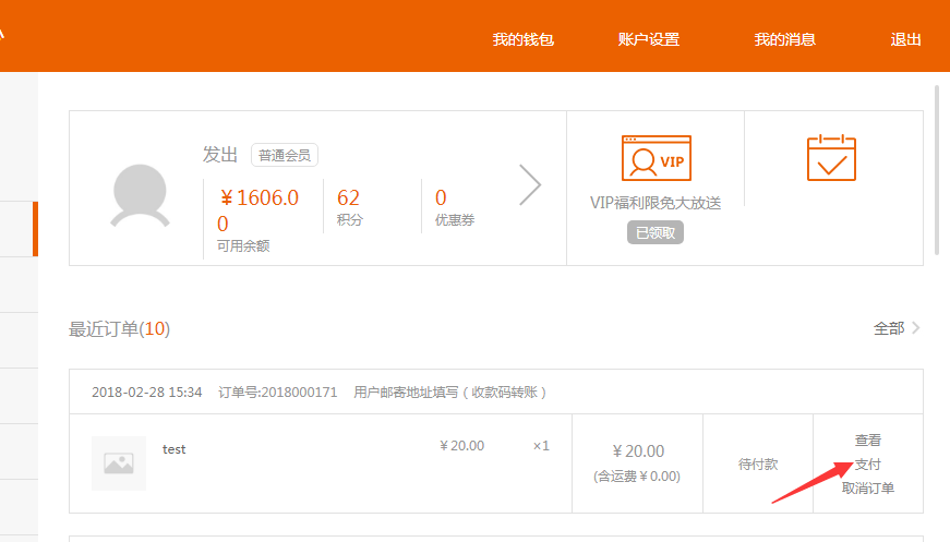 ④.如果還未付款就不小心關了上述頁面,可以在訂單中心里點擊支付查看收款信息