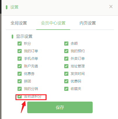 小程序編輯器-設(shè)置-會(huì)員設(shè)置中心增加“簽到送積分”,可在后臺(tái)-營銷活動(dòng)-活動(dòng)設(shè)置-增加簽到分享活動(dòng),用來增加小程序用戶粘性,如下圖: