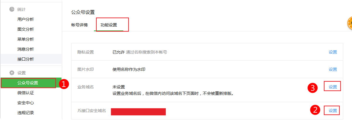 分享獲取積分需要認(rèn)證的服務(wù)號(hào),并在公眾號(hào)設(shè)置-》功能設(shè)置-》js接口安全域名 中設(shè)置關(guān)聯(lián)域名為安全域名。