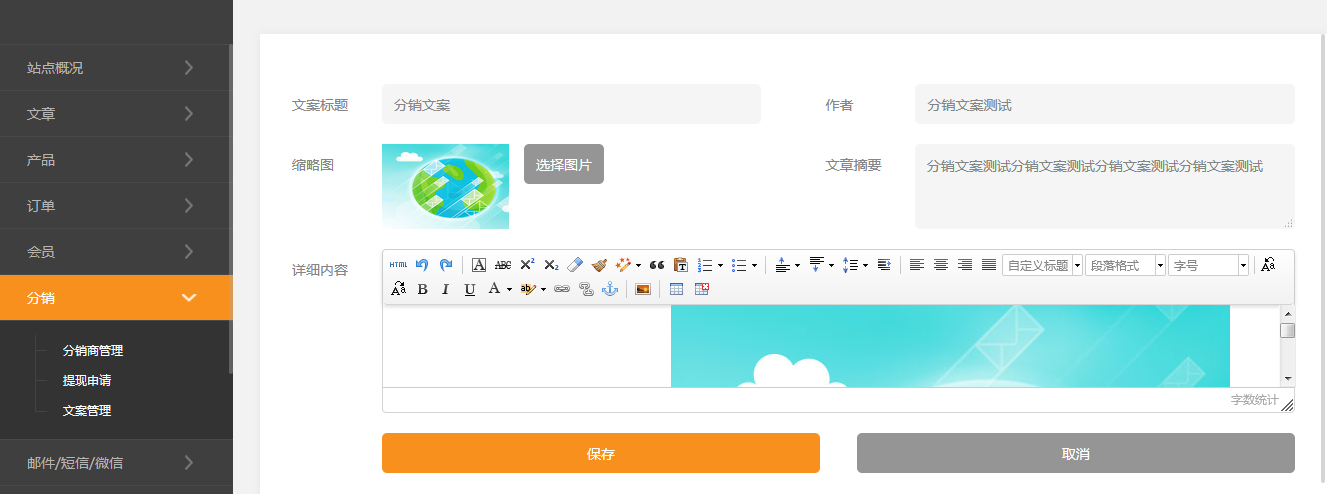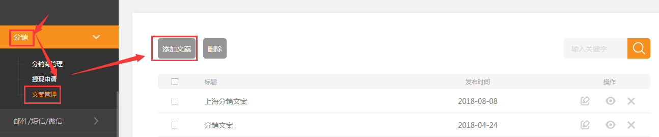 1、在網(wǎng)站后臺(tái)依次點(diǎn)擊 分銷-》文案管理-》添加文案