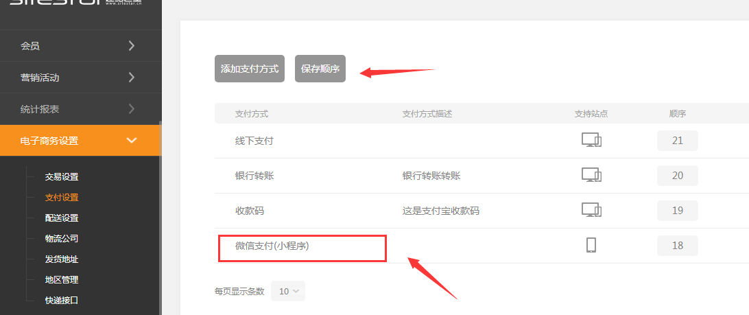 ①.后臺(tái)---電子商務(wù)設(shè)置--支付設(shè)置里,可以添加支付方式。微信支付指的是前臺(tái)生成填寫的設(shè)置,這里會(huì)同步前臺(tái)的填寫內(nèi)容
